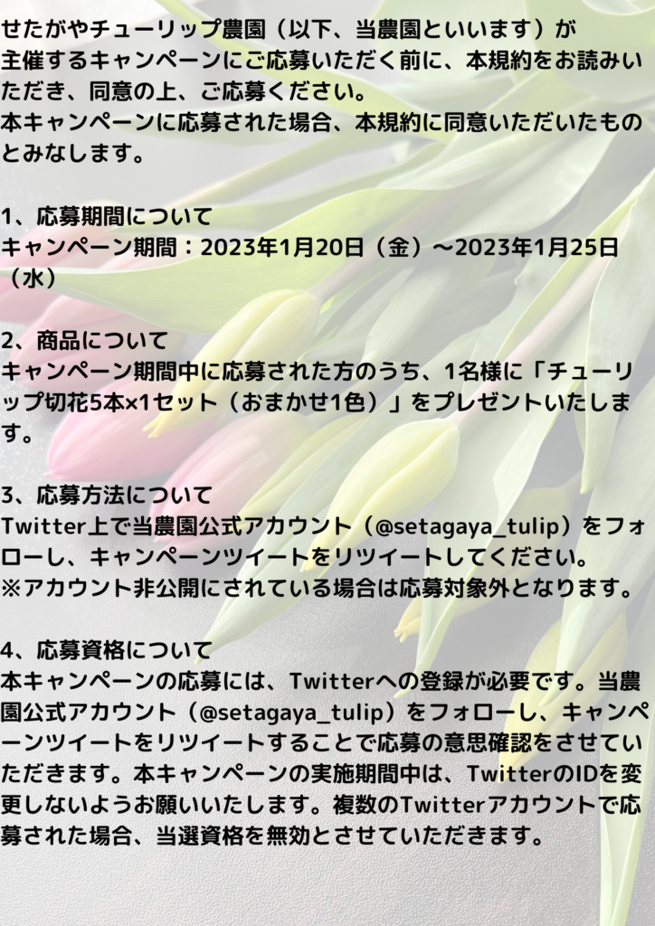 せたがやチューリップ農園がお送りするキャンペーンの規約になります。